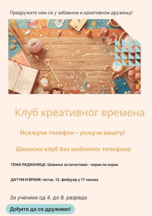 На шестој радионици Клуба креативног времена ученици су, у петак 13. фебруара 2026. године, учили да пришивају дугме, развијајући стрпљење и прецизност у пријатној атмосфери, уз дружење и чај.