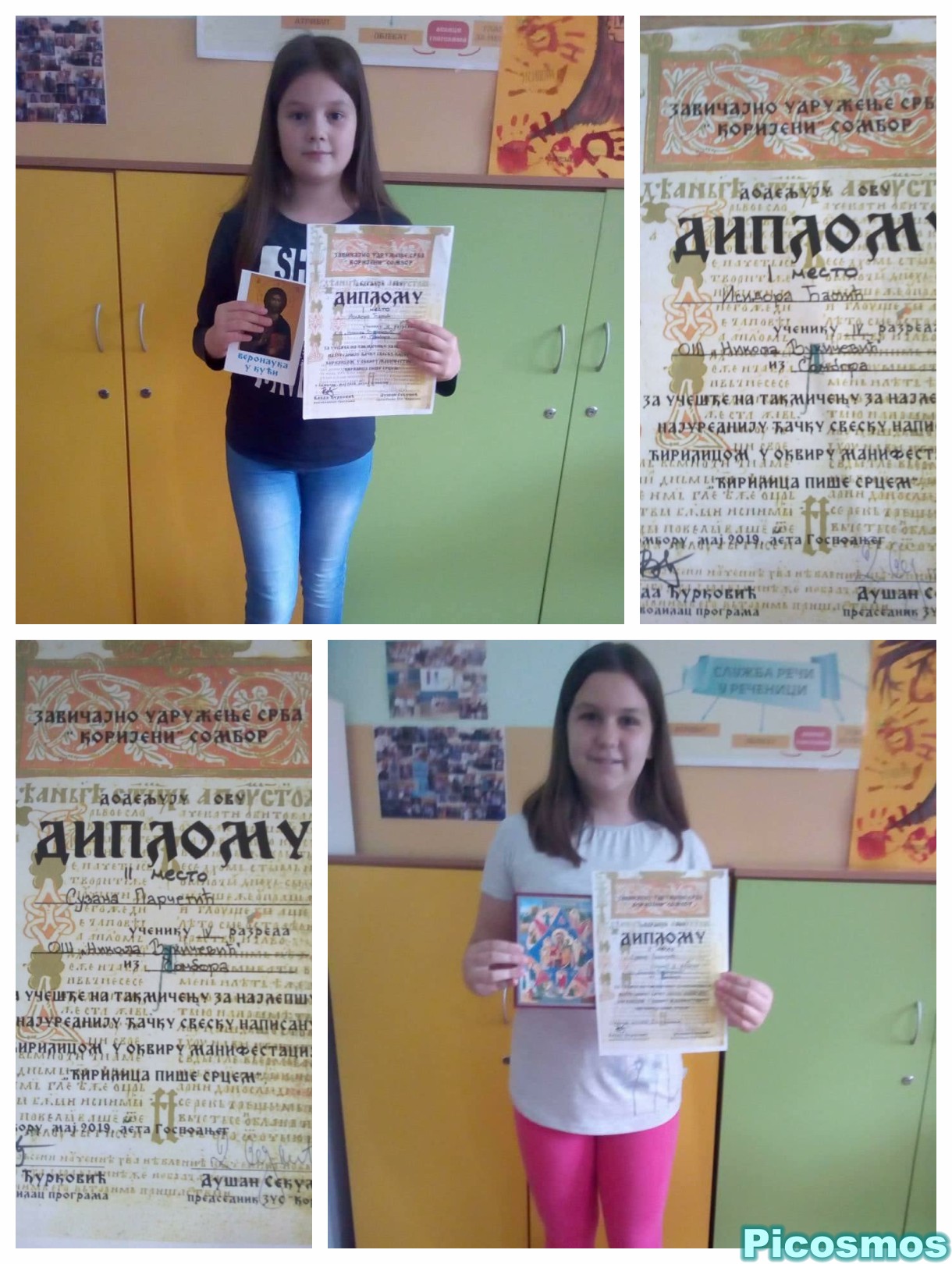 На конкурс за најлепшу свеску написану ћирилицом „Ћирилица пише срцем“ који је расписало Завичајно удружење Срба „Коријени“ из Сомбора награђене су ученице четвртог разреда наше школе Исидора Ћалић (43) и Сузана Парчетић (43). Исидора је освојила прво, а Сузана друго место. Награде су додељене на празник словенске писмености и културе, 24. маја, односно на празник Светих Кирила и Методија.