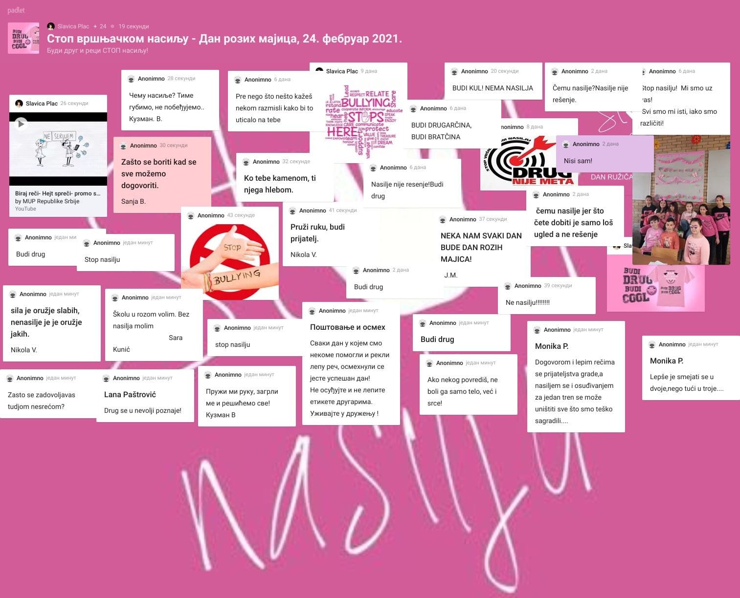 Ученици 12 , 41, 42 и 53 разреда правили су плакате, украшавали паное порукама против вршњачког насиља, а у среду су дошли у школу одевени у мајице розе боје.