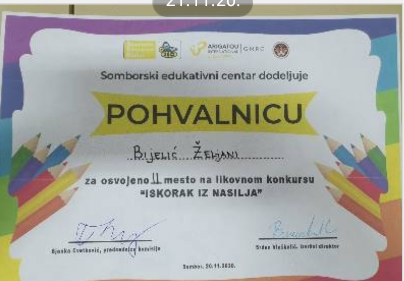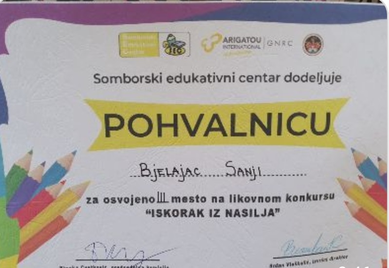 Ученици наше школе узели су учешће на ликовном конкурсу за децу основношколског узраста на тему „Искорак из насиља“ који је расписао Сомборски едукативни центар. Конкурс је у склопу истоименог пројекта који финансира Град Сомбор. Циљ ликовног конкурса је подизање свести о значају дечијих права и одрастању у сигурном и подстицајном окружењу. Жеља организатора конкурса била је да мотивишу ученике основних школа да кроз ликовне радове искажу како за њих изгледа безбрижно одрастање односно окружење без насиља. Својим радовима ученици су послали поруку широј јавности да је ненасилна комуникација и поштовање дечијих права основни предуслов за безбрижно одрастање.