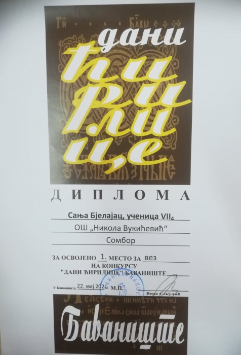 На конкурс „Дани ћирилице“, који се већ шесенаест година налази у Календару републичких смотри Министарства просвете, ове године је стигао 2351 рад, од чега су 449 литерарни, 375 илустрације, 1314 калиграфски радови и иницијали, 107 вез и 106 лутке. Наша ученица Сања Бјелајац (74) учествовала је на ликовном конкурсу у категорији Вез и освојила прву награду. Сањин ментор била је наставница Рената Цветков.
