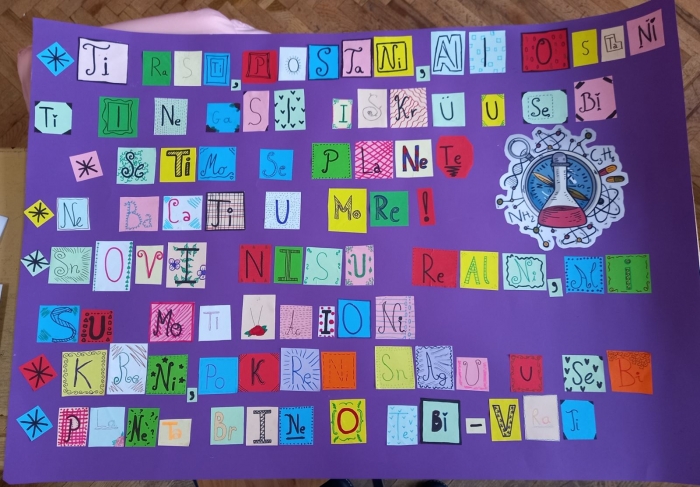Почетна замисао ових радионица била је да ученици наше школе учествују у конкурсу за најлепши слоган састављен од хемијских симбола који је расписала Техничка школа „Змај“ из Београда. Међутим, ученици су, руковођени наставницама хемије Јеленом Зурковић и српског језика Славицом Плац, показали изузетну креативност и одлично познавање материје, те је као продукт њиховог рада настала мала ризница поучних слогана.