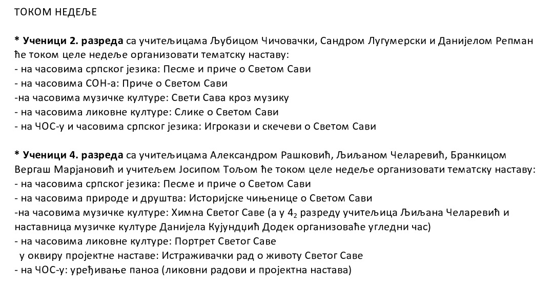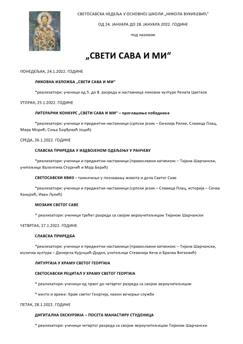Како бисмо у свима и увек неговали дух Светосавља, ученици, наставници и учитељи припремили су низ активности којима ће обележити ову недељу. Програм Светосавске недеље можете преузети и овде.