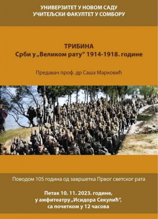 На Педагошком факултету у Сомбору је у петак, 10. новембра 2023. године, обележен јубилеј поводом 105 година од завршетка Првог светског рата. Тим поводом декан проф. др Саша Марковић одржао је инспиративну трибину под називом Срби у „Великом рату“ 1914—1918. године. Трибини су присуствовали и ученици 7. и 8. разреда наше школе и научили нешто ново о овом важном историјском догађају, али се и подсетили на важност сећања и чувања историјске баштине. Ученике је на предавање водила наставница историје Сенка Канурић.