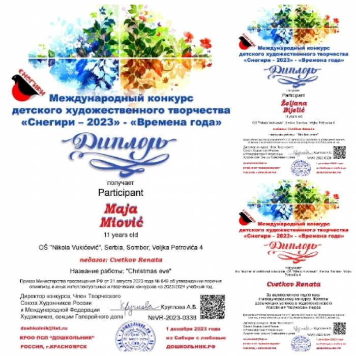 На међународном такмичењу у организацији Министарства просвете Русије под називом „Годишња доба", ученице наше школе Маја Миовић (52) и Жељана Бијелић (82) оствариле су пласман у финале такмичења.
